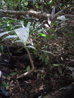 | Field notes | Acaulescent rosette-palm. Leaves 6 per stem; sheath 15cm long, open; petiole 60cm, margined, green; rachis 47cm; lamina 61 x 52cm; pinnae 5 per side, basal 30cm, middle 27cm, apical 26cm. Infructescence interfoliar; peduncular bract 14cm long, soft, brown, inserted 5cm from the base; peduncle 85cm long, 0.5cm thick, smooth; rachis 12cm long, 1cm thick, unbranched; flowers sunken. Transect HB346-SU23. |