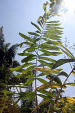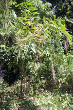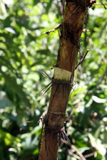 | Field notes | Cespitose understory palm. Stem 2m long, 5cm thick; spines, 5cm long, black. Leaves 11 per stem; sheath 20cm, open; petiole 75cm, round, green; rachis 103cm; lamina 127 x 59cm; pinnae 21 per side, basal 29cm, middle 30cm, apical 29cm. Sterile voucher. Transect HB347-SU16. |