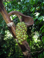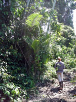 | Field notes | Cespitose understory palm. Stem 2.5m long, 3cm thick; spines, 2cm long, black. Leaves 4 per stem; sheath 44cm, closed; petiole 58cm, round, brown; rachis 185cm; lamina 207 x 98cm; pinnae 42 per side, basal 43cm, middle 56cm, apical 26cm. Inflorescence infrafoliar; prophyll 17cm long, 3.5 wide; peduncular bract 33cm long, woody, green with spines, inserted at the base; peduncle 18cm long, 2cm thick; rachis 13cm long, 3cm thick, unbranched. Transect HB348-way in. |