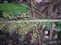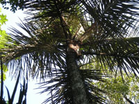 Field notes Cespitose canopy palm. Stem 12m long, 14cm thick; spines 6cm long, black. Leaves 8 per stem; sheath 180cm long, open; petiole 10cm, green; rachis 340cm; lamina 375 x 234cm; pinnae 147 per side, basal 86cm, middle 113cm, apical 34cm. Infructescence interfoliar; prophyll 66(+)cm long, 12cm wide; peduncular bract inserted 85(+)cm from base; peduncle 100(+)cm long, 7cm thick, spiny; rachis 91cm long, branched to 1st order; rachillae 100, 39cm long, 0.3cm thick. Transect HB348-SU74.