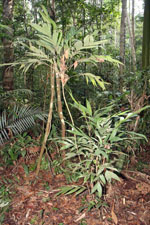 | Field notes | Cespitose understory palm. Stem 2m long, 1.5cm thick. Leaves 15 per stem; sheath 12cm, open; petiole 20cm, margined, green; rachis 44cm; lamina 65 x 32cm; pinnae 4 per side, basal17cm, middle 33cm, apical28cm. Peduncle 10cm long, 0.6cm thick; rachis 12cm long, branched to 2nd order; rachillae 12, 11cm long, 0.2 thick; flowers sunken. Transect HB349-SU21. |