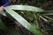 | Field notes | Understory palm. Sheath 9cm, closed; petiole 33cm, green; rachis 9cm; lamina 46 x 32cm, entire, bifid. Peduncular bract 9cm long, soft, brown; peduncle 5cm long, 0.3cm thick, smooth; rachis 4cm long, 0.1cm thick, unbranched. Transect HB349-SU96. |