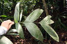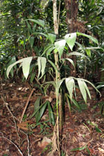 | Field notes | Solitary understory palm. Stem 0.9m long, 1cm thick; crownshaft 15cm long. Leaves 8 per stem; sheath 15cm, closed; petiole 22cm, margined, green; rachis 44cm; lamina 65 x 49cm; pinnae 6 per side, basal 29cm, middle 23cm, apical 26cm. Inflorescence infrafoliar; prophyll 5cm long; peduncular bract 7cm long, soft, green. Transect HB350-SU02. |