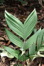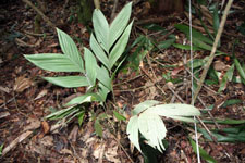 | Field notes | Acaulescent rosette-palm. Leaves 7 per rosette; sheath 13cm long, open; petiole 38cm, margined, green; rachis 32cm; lamina 50 x 29cm; pinnae 3 per side, basal 23cm, middle 25cm, apical 25cm. Sterile voucher. Transect HB350-SU03. |