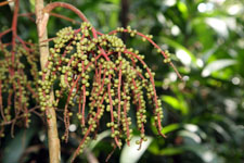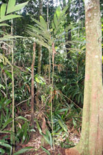 | Field notes | Cespitose understory palm. Stem 3m long, 2cm thick. Leaves 10 per stem; sheath 12cm, open; petiole 26cm, margined, green; rachis 43cm; lamina 64 x 34cm; pinnae 8 per side, basal32cm, middle 38cm, apical24cm. Infloresence infrafoliar; peduncular bract inserted 1cm from base; peduncle 11cm long, 1cm thick; rachis 10cm long, branched to 2nd order; rachillae 12, 17cm long, 0.2 thick; flowers sunken. Transect HB350-SU17. |