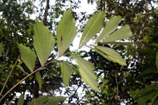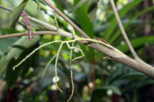 | Field notes | Understory palm. Roots 50, 20cm long, 0.5cm thick; crownshaft 17 cm long. Stem 2m long, 1.5cm thick. Leaves 6 per stem; sheath 17cm, closed; petiole 15cm, round, brown; rachis 45cm; lamina 50 x 40cm; pinnae 6 per side, basal 14cm, middle 25cm, apical 11cm. Inflorescence interfoliar; prophyll 18cm long; peduncular bract 23cm long, soft, green; peduncle 25cm long, 0.5cm wide, smooth; rachis 4cm long, branched to 1st order; rachillae 7, 13cm long, 0.3cm thick; flowers sessile. Transect HB350-SU18. |