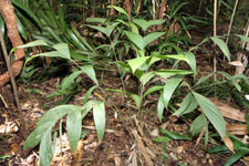 | Field notes | Acaulescent rosette-palm. Leaves 5 per rosette; sheath 15cm long, open; petiole 77cm, margined, green; rachis 67cm; lamina 87 x 50cm; pinnae 4 per side, basal 39cm, middle 39cm, apical 34cm. Infloresence interfoliar; prophyll 14cm long; peduncular bract 17(+)cm, soft, brown; peduncle 72cm long, 0.3cm thick, smooth; rachis 14cm long, 1cm thick, unbranched; flowers sunken. Transect HB350-SU20. |
