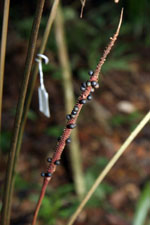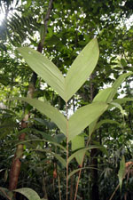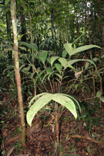 | Field notes | Solitaryr understory palm; roots 50, 5cm long, 0.2cm thick. Stem 60cm long, 4cm thick. Leaves 11 per stem; sheath 23cm, open; petiole 65cm, margined, green; rachis 70cm; lamina 97 x 66cm; pinnae 4 per side, basal 30cm, middle 46cm, apical 42cm. Prophyll 31cm long; peduncular bract 31cm long, soft, brown; peduncle 49cm long, 0.6cm thick; rachis 29cm long, 1cm thick, unbranched; flowers sunken. Transect HB350-SU21. |