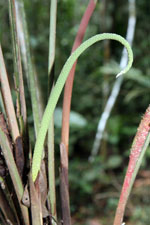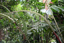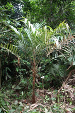 | Field notes | Solitary, erect, understory palm. Roots 300, 20cm long, 0.2cm thick. Stem 0.9m long, 5cm thick. Leaves 15 per stem; sheath 24cm, open; petiole 67cm long, margined, green; rachis 103cm; lamina 124 x 77cm; pinnae 17 per side, basal 34cm, middle 52cm, apical 40cm. Inflorescence interfoliar; prophyll 44cm long; peduncular bract 47cm long, soft, brown; peduncle 73cm long, 1.5cm thick; rachis 50cm long, 1.5cm thick, unbranched; flowers sunken, grey. Transect HB352-SU55. |