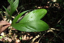 | Field notes | Juvenile, solitary, palm. Leaves 7 per stem; sheats 7cm, open; petiole 17cm, margined, green; rachis 20cm long; lamina 30 x 15cm entire, bifid. Sterile voucher. Transect HB354-SU70. |