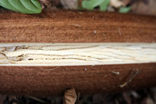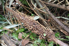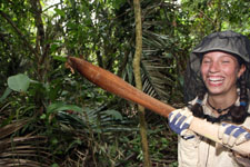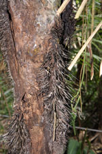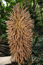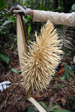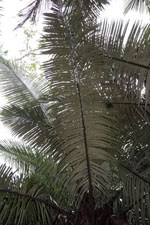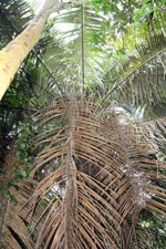 | Field notes | Solitary, large palm. Stem 5m long, 25cm thick. Leaves 12 per stem; sheath 110cm, open; spines 10cm long, black; petiole 150cm, green; rachis 430cm; lamina 475 x 280cm; pinnae 102 per side, basal 70cm, middle 125cm, apical 60cm. Inflorescence interfoliar; prophyll 25(+)cm long, 12cm wide; peduncular bract 110cm long, woody, brown, spiny, inserted 40(+)cm from the base; peduncle 90(+)cm long, 4cm thick, smooth; rachis 47cm long, branched to 1st order; rachillae 350, 17cm long, 0.5cm thick; flowers sessile, yellow. Transect HB356-outsideSU01. |