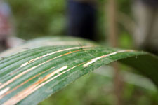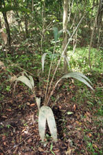 | Field notes | Juvenile rosette palm. Leaves 5; sheats 35cm, closed; spines 3 cm long, black; petiole 56cm, green, spiny; rachis 27cm long; lamina 57 x 22cm, entire, bifid, or some leaves larger with 2 pinnae. Sterile voucher. Transect HB356-SU98. |
