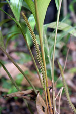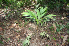 | Field notes | Solitary, understory palm. Stem creeping, ascending. Leaves 8 per stem; sheath 16cm, closed; petiole 28cm long, margined, green; rachis 38cm; lamina 53 x 27cm; pinnae 3 per side, basal 21cm, middle 23cm, apical 21cm. Inflorescence interfoliar; prophyll 12cm long; peduncular bract 18cm long, soft, brown, inserted at the base; peduncle 35cm long, 0.3cm thick; rachis 18cm long, 0.5cm thick, unbranched; flowers sunken, white. Transect HB357-SU11. |