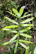 | Field notes | Juvenile rosette palm. Leaves 5; sheath 15cm, open; petiole 20cm, round, green; spines 2.5cm long, black; rachis 30cm; lamina 43 x 44cm; pinnae 4 per side, basal 20cm long, middle 23cm, apical 22cm. Sterile voucher. Transect HB359-SU14. |