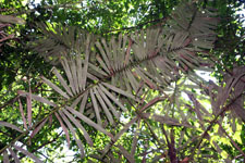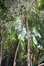 | Field notes | Colonial understory palm. Stem 4m long, 4cm thick; spines 5cm long, black. Leaves 6 per stem; sheath 30cm, open; petiole 60cm, green; rachis 170cm; lamina 190 x 65cm; pinnae 43 per side, basal 33cm, middle 40cm, apical 18cm. Sterile voucher. Transect HB360-SU88. |