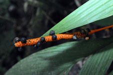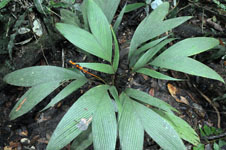 | Field notes | Solitary understory palm. Acaulescent. Leaves 10; sheath+petiole 36 cm long, sheath open; rachis 35 cm long; lamina entire or splitting up, 55 cm long, 21 cm wide; pinnae 1-2 per side. Infructescence interfoliar; prophyll 8 cm long, 1.5 cm wide; peduncular bract 20 cm long, brown; peduncle 48 cm long, 0.5 cm thick, green-orange; spike 13 cm long, 1 cm thick, orange. Fruits green. HB transect 404, subunit 33. |