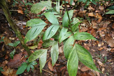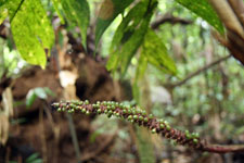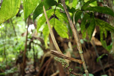| Field notes | Cespitose understory palm with few visible roots. Stem 0.7 m tall, 0.8 cm thick, smooth, greenish cream; internodes 5 cm long. Leaves 7; leaf sheath 15 cm long, open; petiole 15 cm long, section round; rachis 31 cm long; lamina pinnate, 48 cm long, 30 cm wide, glabrous; pinnae 3 per side, regularly inserted; basal pinna 22 cm long, middle pinna 25 cm long, apical pinna 35 cm long. Infructescence infrafoliar; peduncular bract 10 cm long, inserted 10 cm from base, papery, yellow; peduncle 8 cm long, 0.5 cm wide. Fruits 0.5 x 0.5 cm, black. Transect HB140, subunit no. 030, inside transect; UTM: 20K-311063-8107965 |