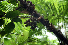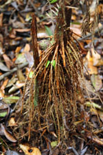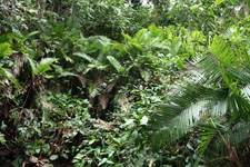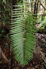 | Field notes | Understory colonial palm. Stem 3.5 m tall, 4 cm thick; internodes 16 cm long, brown; base of stem with over 50 visible roots, 20 cm long, 0.3 cm thick. Leaves 5 per stem; leaf sheath 15 cm long, open, with 5 cm long black spines; petiole 45 cm long, section round, with 5 cm long cream-colored spines; rachis 64 cm long; lamina pinnate, 70 cm long, 40 cm wide, glabrous; pinnae 38 per side, regularly inserted; basal pinna 17 cm long, middle pinna 20 cm long, apical pinna 6 cm long. Infructescence infrafoliar; peduncle 23 cm long, 0.8 cm wide; rachis 2 cm long, 0.8 cm wide; rachillae 6, 7-10 cm long. Fruits 1 x 1 cm, cream-colored. Transect HB140, subunit no. 092, inside transect; UTM: 20K-311367-8108025 |