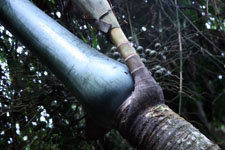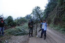 | Field notes | Solitary canopy palm. Base with stilt roots. Stem 12 m long, 18 cm diam, smooth; internodes 21 cm long, grey. Crownshaft 1 m long. Leaves 4; leaf sheath closed; petiole 23 cm long, section margined; lamina pinnate, 286 cm long, 204 cm wide; pinnae 37 per side, inserted in groups of 11; basal pinna 23 cm long, middle pinna 102 cm long, apical pinna 70 cm long. Inflorescence: prophyll 25 cm long, 10 cm wide, woody; peduncular bract 120 cm long, green, woody; peduncle 36 cm long, 5 cm wide; rachis 80 cm long, 3 cm wide; rachillae 61, 16-50 cm long. Flowers cream. Fruits 3.5 cm long, 2.5 cm wide. Local name: “Tola”. Informant Jaime Amos. Transect HB154, outside transect; UTM: 19L-560783-8343326 |